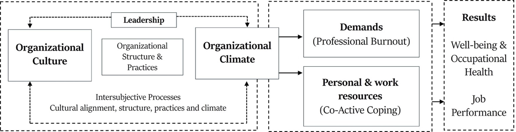 Lazarus and Folkman's transactional model, central to research on coping strategies, describes coping resources as cognitive and behavioral efforts to manage perceived excessive demands. Two main types are distinguished: problem-focused coping, which seeks to solve the problem directly, and emotion-focused coping, which manages stress-related emotions. Folkman (2007) expanded the model by including positive emotions and introducing “meaning-focused coping,” which considers both negative and positive emotions (Obbarius et al., 2021). Beyond the traditional focus on individual coping resources, recent studies highlight the importance of collective job resources (Bakker et al., 2023). The concept of Co-active Coping (CAC), introduced in the MM-SWE model, describes how members of an organization adopt similar coping strategies, generating shared ideas and beliefs to manage stressful situations. In this context, culture and organizational climate are fundamental. Although co-active coping begins at the individual level, it extends through imitation and vicarious learning, becoming an organizational phenomenon (Barría-González et al., 2023; Rodríguez et al., 2019).