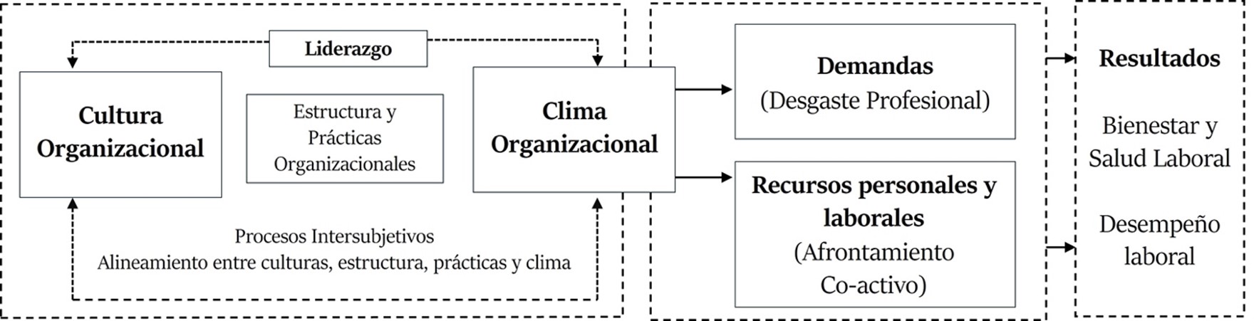 In the organizational field, Pérez-Luco (2008) introduced the construct of Subjective Work Environment (SWE) as a generic concept, later expanded by Barría-González et al. (2021; 2023) in the Multidimensional Model of Subjective Work Environment (MM-SWE). This model integrates the dimensions of organizational climate and culture, professional burnout, psychosomatic symptoms, and coping styles, offering a complete vision of organizational dynamics from a subjective perspective. Furthermore, the MM-SWE is based on the Multilevel Model of Organizational Culture and Climate (MMOCC) by Ostroff et al. (2012) and the Theory of Labor Demands and Resources (TLDR) by Bakker and Demerouti (2018).
