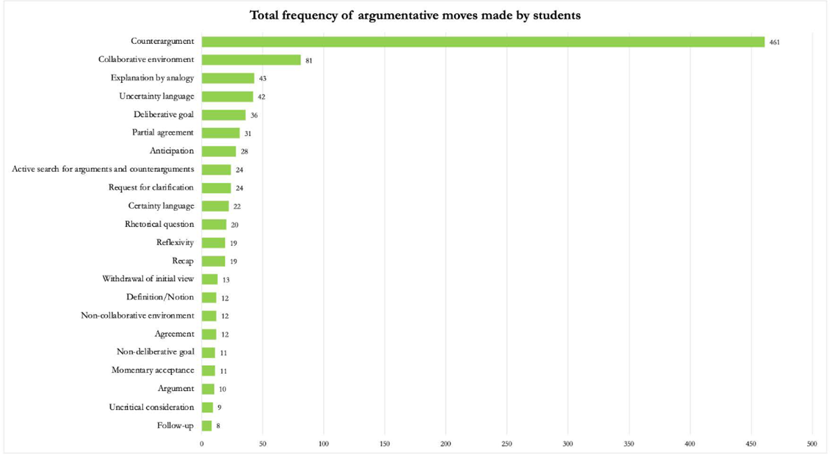 Figure 1 shows the frequency of argumentative moves used by students. As observed, students mainly used counterargument, collaborative environment, explanation by analogy, uncertainty language, deliberative goal, partial agreement, and anticipation.