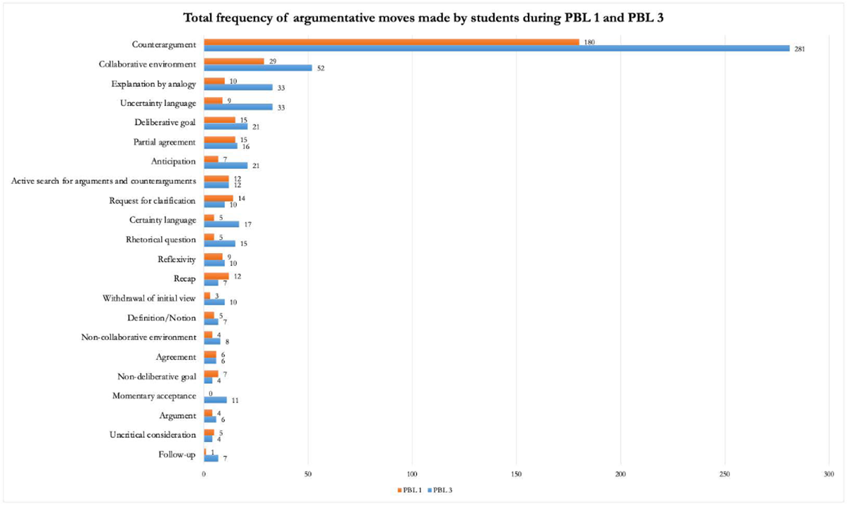 Frequencies of argumentative moves used in sessions PBL 1 and PBL 3