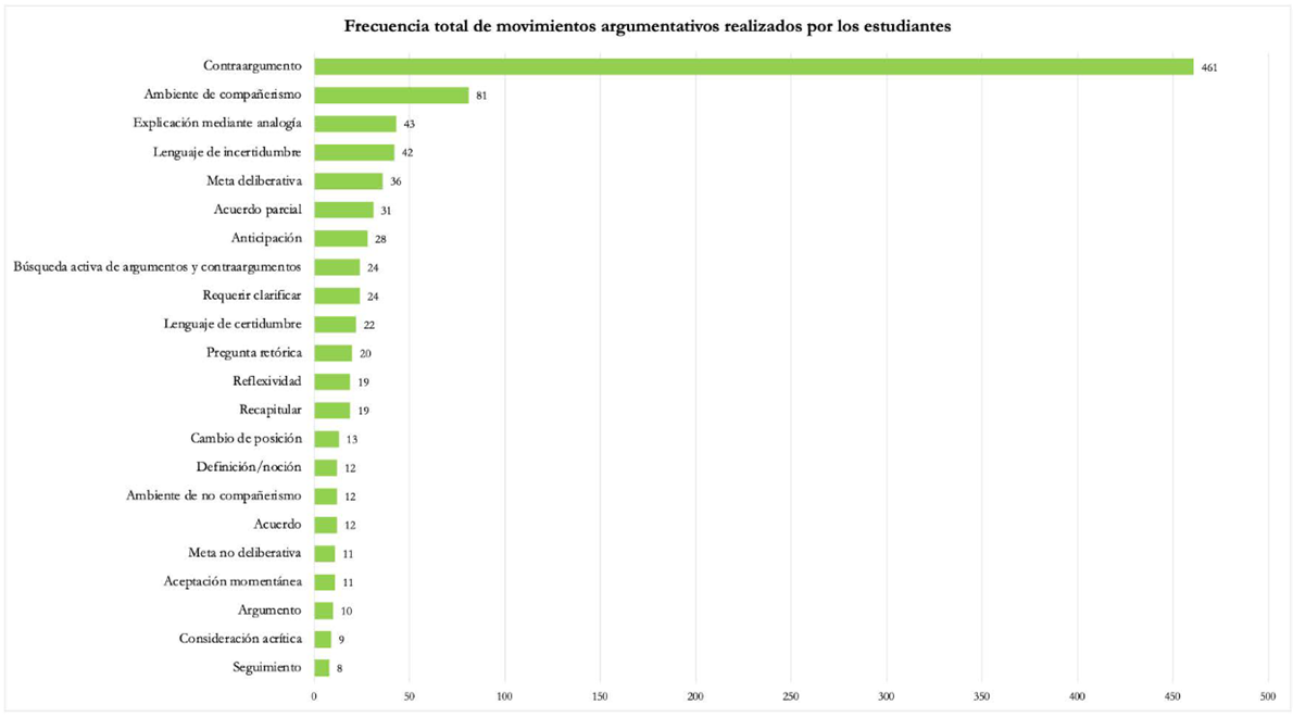 De los hallazgos, distintas implicancias teóricas y prácticas surgen para la enseñanza universitaria. En primer lugar, en términos generales, los/las estudiantes realizaron movimientos argumentativos que, de acuerdo a la literatura, promueven el aprendizaje. A los/las estudiantes se le solicitó que analizaran “ambos lados de cada alternativa” para llegar a la mejor solución posible. Los/las estudiantes no solo lograron explorar conocimiento a favor y en contra de cada posición, sino que lo realizaron a través de movimientos argumentativos claves para la construcción de conocimiento. Como se ha señalado, el contraargumento fue el movimiento más utilizado por los/las estudiantes (Leitão, 2000), que es un movimiento semiótico clave para la revisión del conocimiento y el desarrollo metacognitivo. La alta frecuencia del contraargumento en este estudio contradice otros, que, focalizados mayoritariamente en la argumentación escrita, muestran que los contraargumentos y las refutaciones ocurren con poca frecuencia (Felton & Herko, 2004).