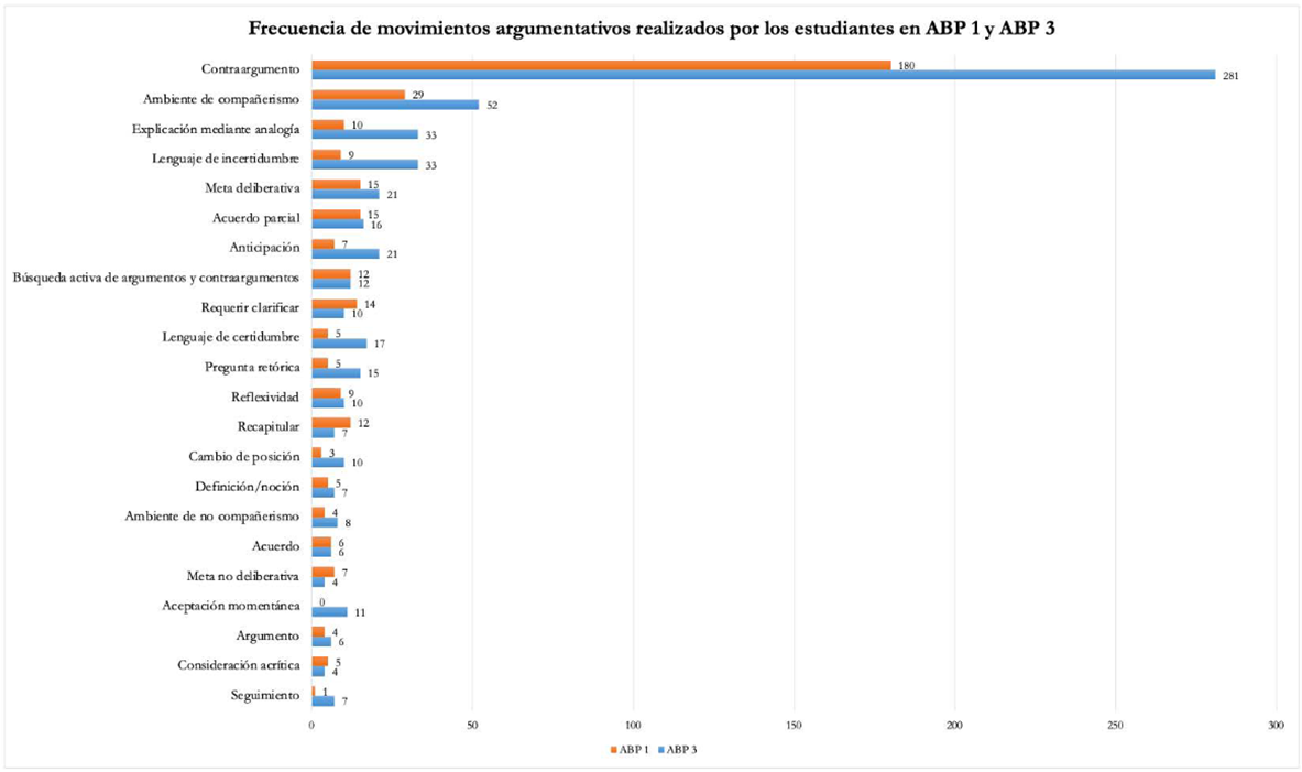 Adicionalmente, los/las cuatro estudiantes avanzaron respecto del uso de movimientos argumentativos durante el ABP, es decir, usaron más y distintos movimientos argumentativos. Por ejemplo, Ricardo en su primera actividad intervino a través del uso de contraargumento, definición, reflexividad, meta deliberativa y no deliberativa. En el último realizó contraargumento, lenguaje de certidumbre e incertidumbre, acuerdo parcial, meta deliberativa, pregunta retórica, anticipación, requerir clarificar y explicación mediante analogía.