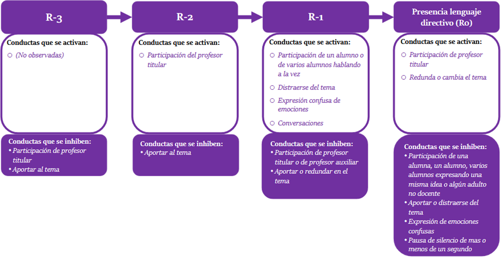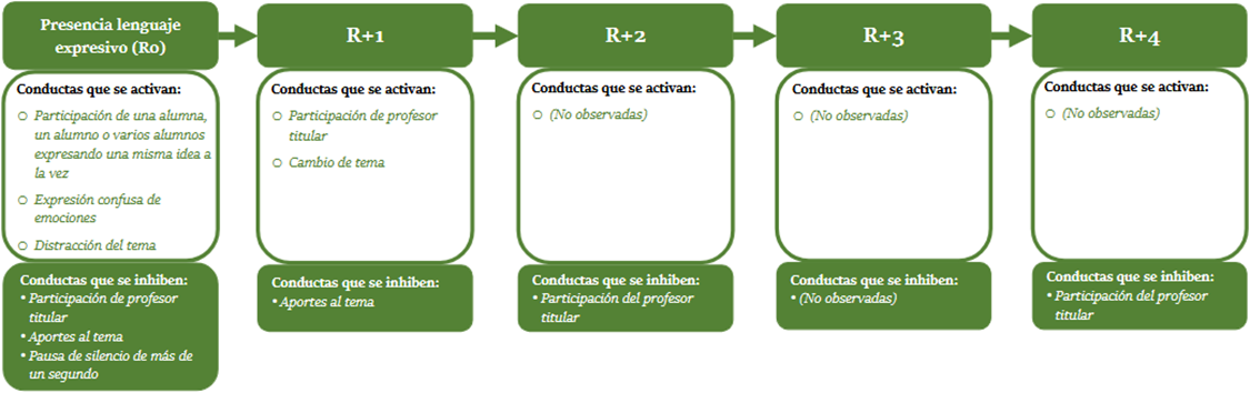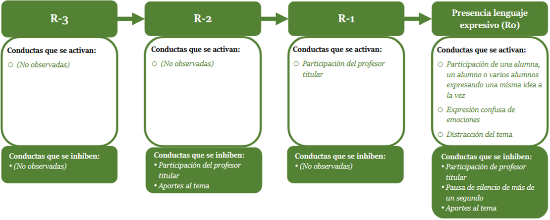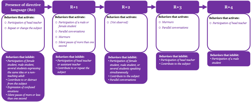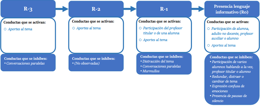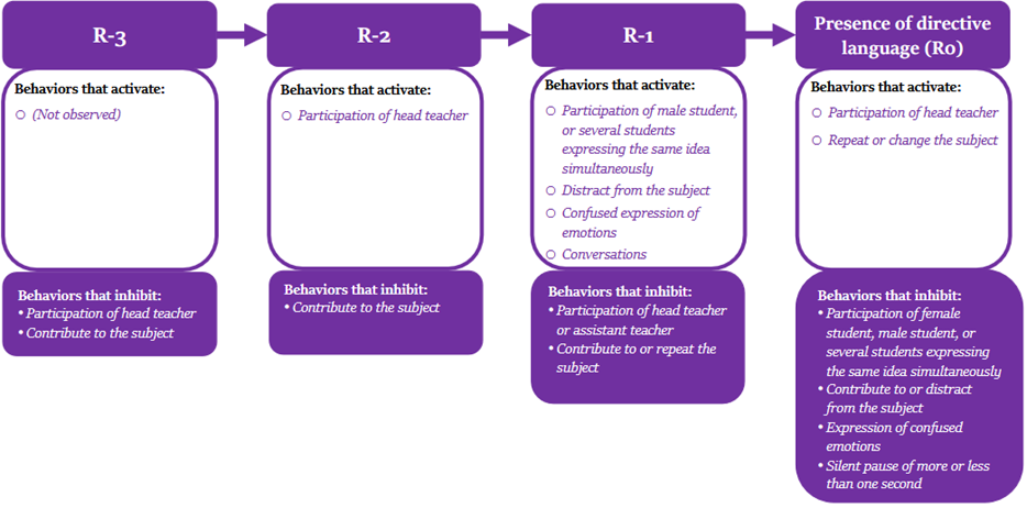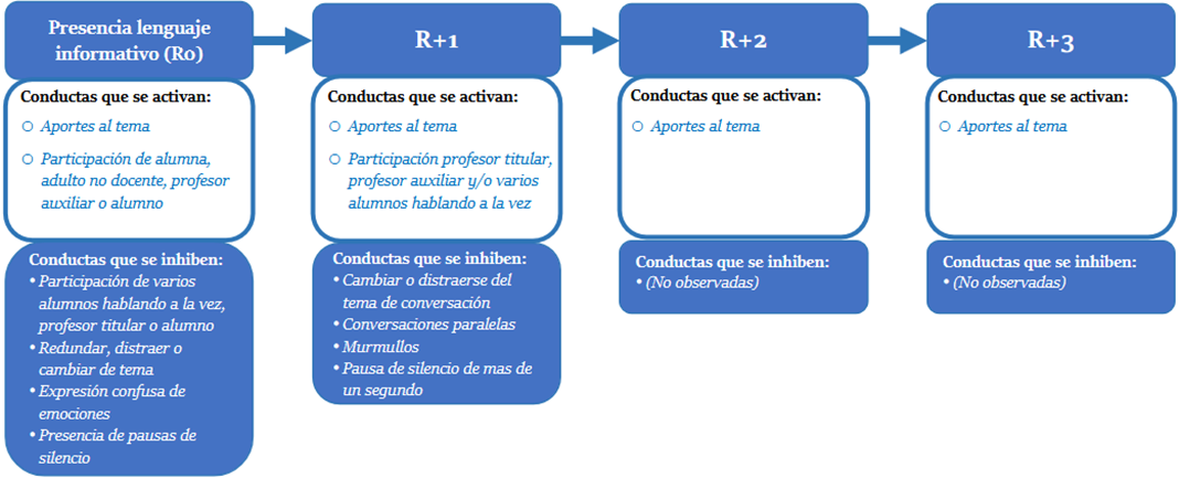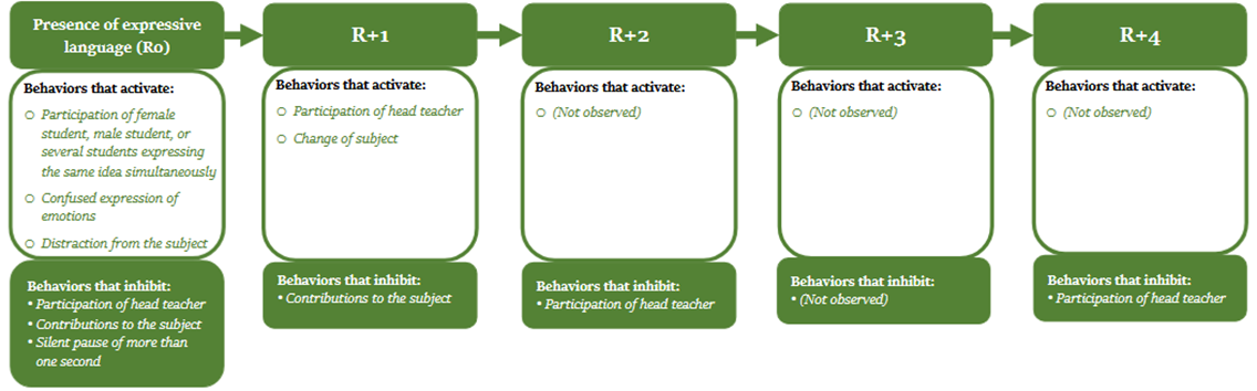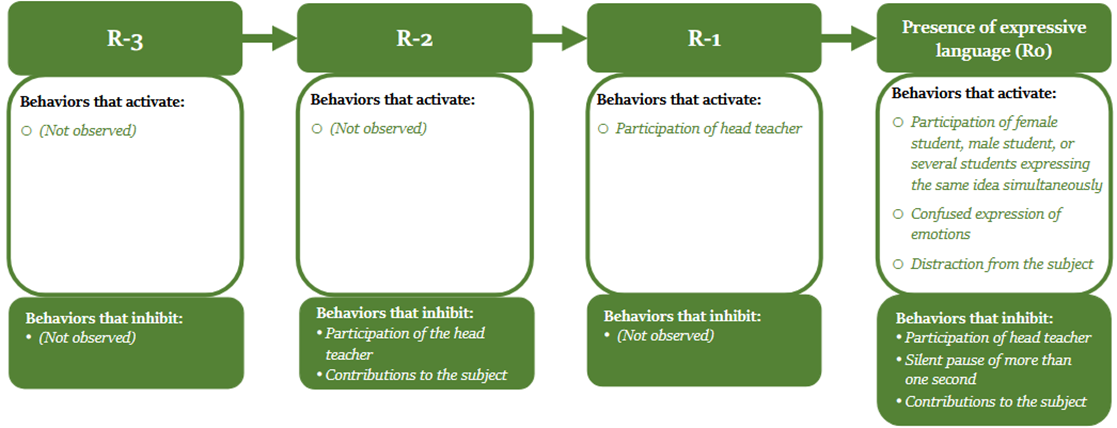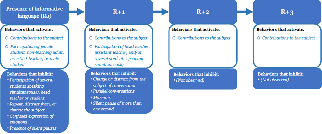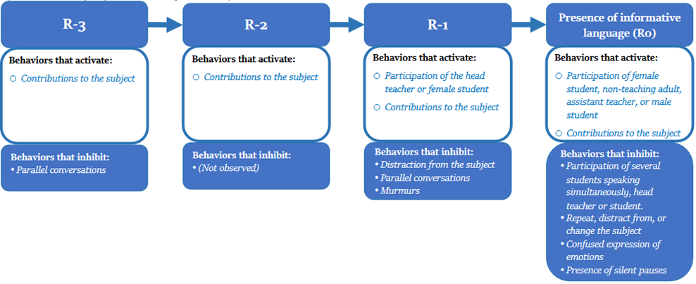 Before the informative language (C11) is presented, the head teacher (E1) or a female student (E3) will have participated by contributing to the subject of conversation (B11), inhibiting the distraction from the subject of conversation (B14), parallel conversations (S2), and/or murmurs (S1). In R-2 and R-3, the subject (B11) will also have been contributed to, and in R-3, parallel conversations (S2) will have been inhibited. After the informative language is presented (C11), in R+1 the subject of conversation (B11) will be contributed again, activating the participation of the head teacher, the assistant teacher (E2), and/or several students expressing the same idea simultaneously (E5), and the possibilities of changing the subject of conversation (B12), distraction from the subject of conversation (B14), parallel conversations (S2), murmurs (S1) and/or the presence of a silent pause of more than one second (S2) will be inhibited. In R+2 and R+3, the subject will be covered.