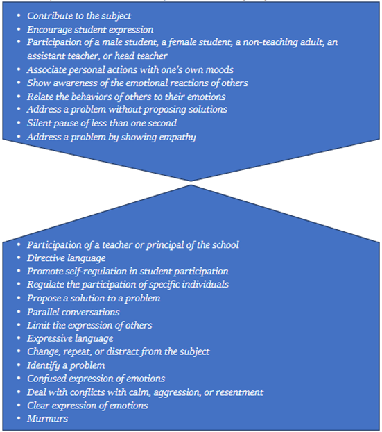 Each observation unit was coded based on the ad hoc observation instrument “Guideline for the Observation of Communication and Emotional Self-Regulation”, in Spanish: “Pauta para la Observación de la Comunicación y Autorregulación Emocional” (OCAE; Alarcón-Espinoza et al., 2024), created based on dimensions and subdimensions with their respective category systems. This instrument has the following large dimensions: (a) Knowledge of one's own and other people's emotions, (b) Focus on the task, (c) Assertive communication, and (d) Conflict management.