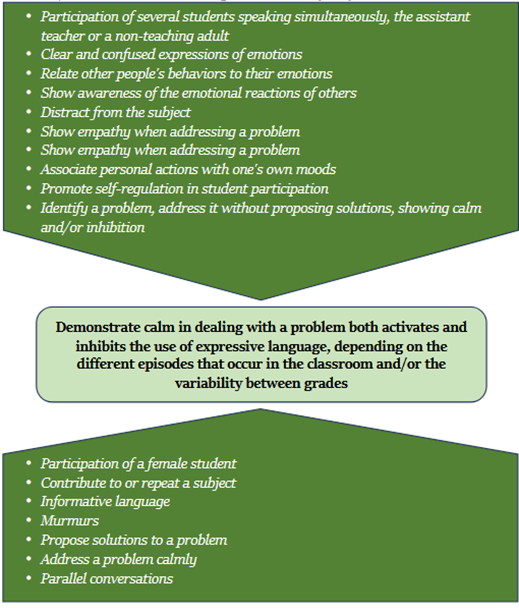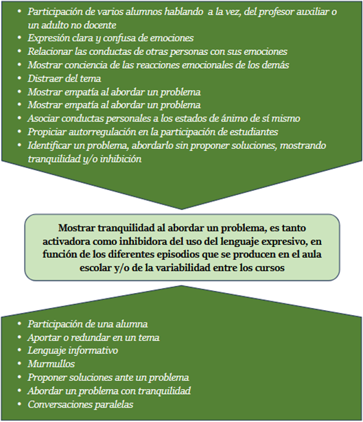 El hecho de mostrar tranquilidad al abordar un problema es tanto activadora como inhibidora del uso del lenguaje expresivo, en función de los diferentes episodios que se producen en el aula escolar y/o de la variabilidad entre los cursos.