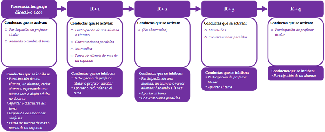 El lenguaje directivo, observado mediante el análisis secuencial de retardos, es utilizado mayoritariamente por un/una profesor/a titular y suele conllevar el redundar o cambiar el tema de conversación. Esta conducta posiblemente habrá estado antecedida por una serie de comportamientos que llevan a desviarse del tema que se está tratando, que muy posiblemente también habrán sido antecedidos por el uso del lenguaje directivo. En este sentido, es discutible el efecto real del lenguaje directivo para regular la conducta del estudiantado, puesto que al observar las conductas que preceden a este tipo de lenguaje, se aprecia que se mantienen las conversaciones paralelas y/o los murmullos y que, si bien se observa la participación de algún estudiante, es preciso señalar que se inhiben los aportes al tema y/o las posibilidades de redundar en el tema, en retardos sucesivos. Lo cual invita a revisar la intención educativa del docente (Santos-González, 2022) y el tipo de relación comunicativa que se establece, pues como señala Watzlawick et al. (1991), todo acto comunicativo lleva consigo un determinado contenido y una determinada relación; y en cada una de estas secuencias de conductas, se negocia las formas de relación e interacción comunicativa en el aula (Arís Redó, 2010), tanto en el aquí y ahora, como en el futuro (Encinas, 2018).