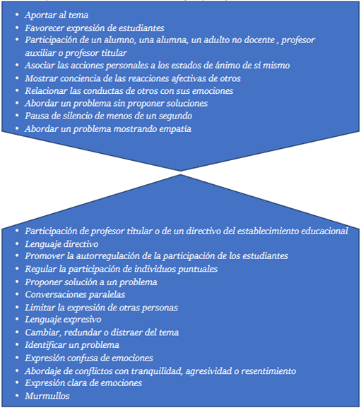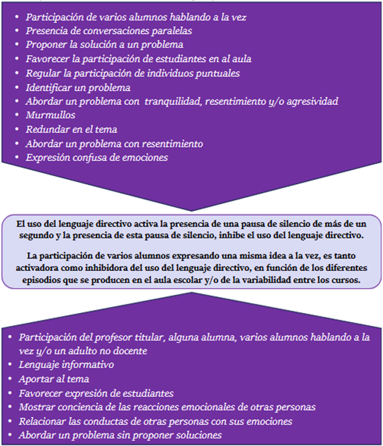 Junto con lo anterior, el uso del lenguaje directivo se inhibe mutuamente con el uso del lenguaje informativo, las acciones de aportar al tema de conversación, y favorecer la expresión de los estudiantes, y con la participación de el/la profesor/a titular. Además, el lenguaje directivo se inhibe mutuamente con la participación de alguna alumna, las acciones de mostrar conciencia de las reacciones emocionales de otras personas y de relacionar las conductas de otras personas con sus emociones, con la acción de abordar un problema sin proponer soluciones, y con la participación de varios alumnos expresando una misma idea a la vez y/o de un adulto no docente o estudiante de curso superior.