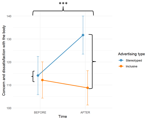 Note. The X-axis represents time (before and after), and the Y-axis represents the average score (and its standard error) on the body image questionnaire. The two types of advertising are shown: stereotypical and inclusive. The interaction effect with keys is emphasized. *** = p < .001.
