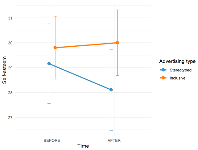 Note. The X-axis represents time (before and after), and the Y-axis represents the average score (and its standard error) on the self-esteem questionnaire. The two types of advertising are shown: stereotypical and inclusive.
