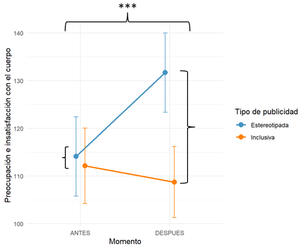 Nota. El eje X representa el momento (antes y después), y el eje Y representa el puntaje promedio (y su error estándar) en el cuestionario de imagen corporal. Se muestran los dos tipos de publicidad: estereotipada e inclusiva. Se enfatiza el efecto de interacción con las llaves. *** = p < ,001.