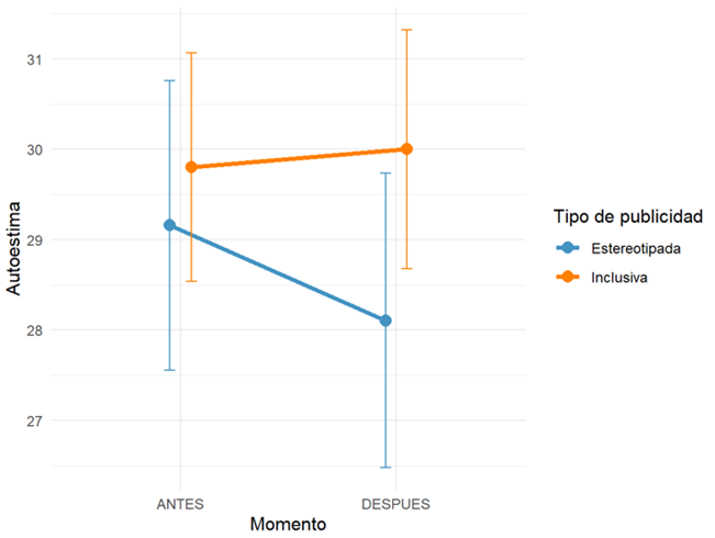Nota. El eje X representa el momento (antes y después), y el eje Y representa el puntaje promedio (y su error estándar) en el cuestionario de autoestima. Se muestran los dos tipos de publicidad: estereotipada e inclusiva.